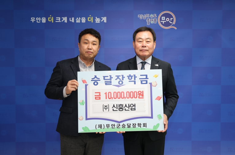 [메이저뉴스]전남 무안군은 지난 1일 지역인재 육성을 위해 ㈜신흥산업이 장학금 1천만 원을, 청솔수산 윤낙진 대표가 장학금 1백만 원을 각각 (재)무안군승달장학회에 기탁했다고 밝혔다.