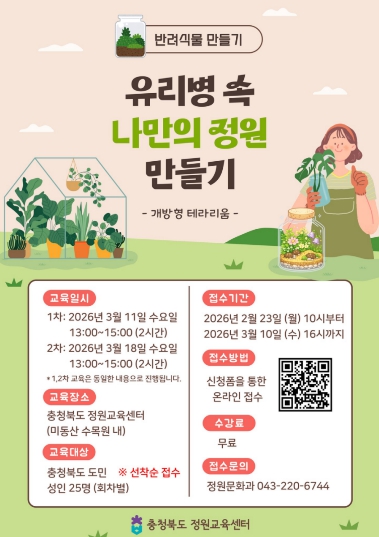 [메이저뉴스]충청북도 정원교육센터는 도민들이 식물과 교감하며 정원문화를 일상에서 즐길 수 있도록 ‘반려식물 만들기(유리병 속 나만의 정원 만들기)’ 교육을 오는 3월 11일과 18일 총 2차례에 걸쳐 운영한다.