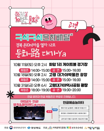 [메이저뉴스]2025 문화가 있는 날 '구석구석 문화배달' 경북 온(On)마을 열차 12호 고령군 ‘문화路 대가ya’가 10월 문화의 달을 맞아 총 3회의 공연을 선보인다. 이번 행사는 문화체육관광부와 경상북도가 주최하고, 지역문화진흥원·경북문화재단·예술마을사람들이 주관하며, 고령군과 협력해 진행된다.