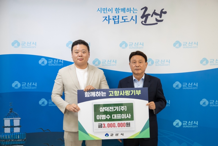 [메이저뉴스]군산시는 삼덕전기(주) 이병수 대표이사가 고향사랑기부금 300만 원을 기탁했다고 밝혔다.