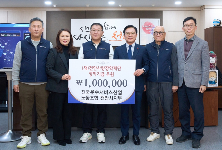 [메이저뉴스]천안시는 30일 전국운수서비스산업노동조합 천안시지부가 미래 인재 양성을 위해 천안사랑장학재단에 2031년까지 매년 장학기금 100만 원을 기탁하기로 약속했다고 밝혔다.