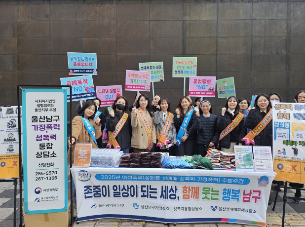 [메이저뉴스] 울산 남구는 ‘2025년 여성폭력 추방주간’을 맞아 27일 삼산 디자인거리 일대에서 울산성매매피해상담소와 울산남구가정폭력·성폭력통합상담소가 함께 ‘2025년 여성폭력 추방주간 캠페인’을 실시했다.