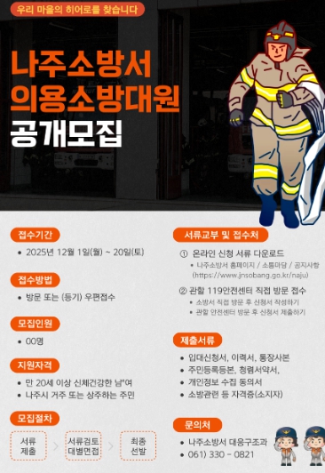 [메이저뉴스]나주소방서는 지역사회의 안전을 책임질 “2025년 하반기 의용소방대 신규대원 모집”에 나선다. 모집 기간은 오는 12월 1일부터 20일까지이며, 신천서류는 나주소방서 홈페이지 또는 나주소방서를 비롯한 119안전센터에서 지원 서류를 배부하고 접수를 진행한다.