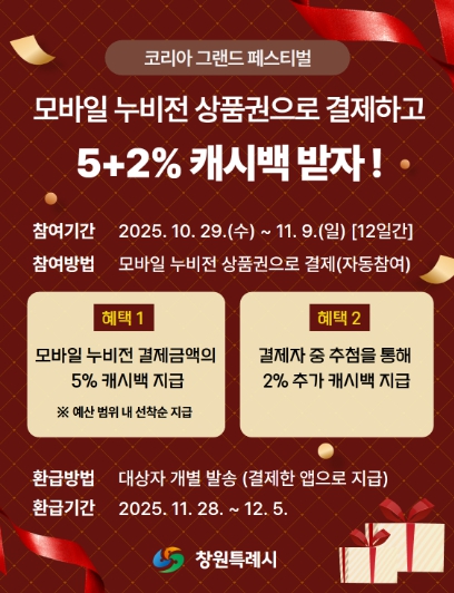 [메이저뉴스]창원특례시는 오는 10월 29일부터 11월 9일까지 12일간, ‘코리아 그랜드 페스티벌’ 기간에 맞춰 모바일 창원사랑상품권 ‘누비전’ 결제 시 최대 7% 캐시백을 제공하는 특별 이벤트를 진행한다고 24일 밝혔다.