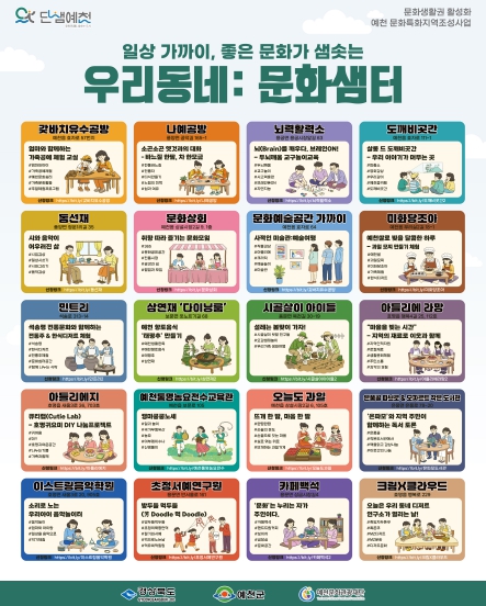 [메이저뉴스] (재)예천문화관광재단은 ‘문화특화지역 조성사업’의 일환으로 추진 중인 ‘우리동네 문화샘터’의 공간별로 세부 프로그램 공개, 오는 28일까지 참여자를 모집한다.