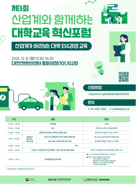 [메이저뉴스] 교육부는 한국공학교육인증원(원장 김우승), 대전테크노파크(원장 김우연) 대전 라이즈센터와 함께 12월 8일(월), 대전컨벤션센터에서 ‘제3회 산업계와 함께하는 대학교육 혁신포럼’을 개최한다.