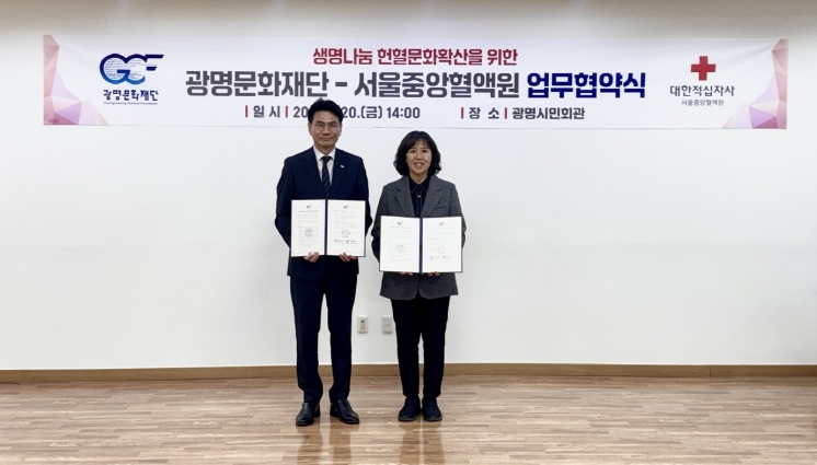 [메이저뉴스] (재)광명문화재단(대표이사 송은영)은 서울중앙혈액원(원장 이재용)과 함께 2월 20일 오후 2시에 광명시민회관에서 '헌혈자 대상 문화예술 프로그램 제공 및 헌혈 문화 정착을 위한 업무협약'을 체결했다고 밝혔다.