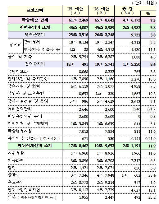 현용 군사력 운영을 위한 전력운영비는 2025년 대비 5.8% 증가한 45조 8,989억원으로 확정됐다.