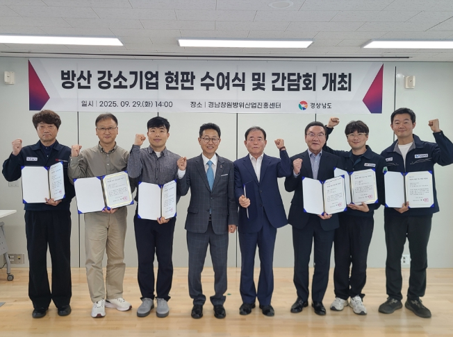 [메이저뉴스]경상남도는 29일 경남창원방위산업진흥센터에서 ‘2025년 방산 강소기업 지정 현판식 및 기업 간담회’를 개최했다.