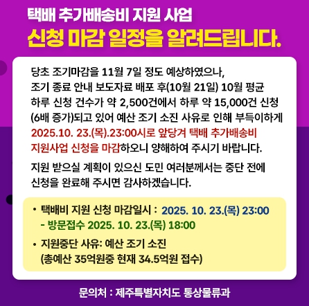 [메이저뉴스]제주특별자치도는 택배 추가배송비 지원 사업이 당초 11월 7일 종료 예정이었으나, 신청 급증으로 10월 23일 오후 11시(방문 접수 오후 6시)에 조기 종료된다고 밝혔다.